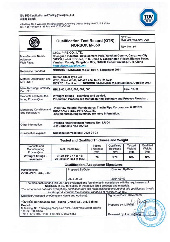 公司已通過挪威國家石油標準NORSOK M-650 ASTM A234 WPB認證。