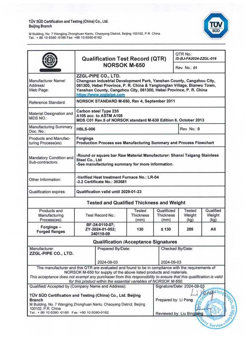 【概要描述】公司已取得NORSOK M-650 ASTM A105 材質鍛件的挪威國家石油標準認證。