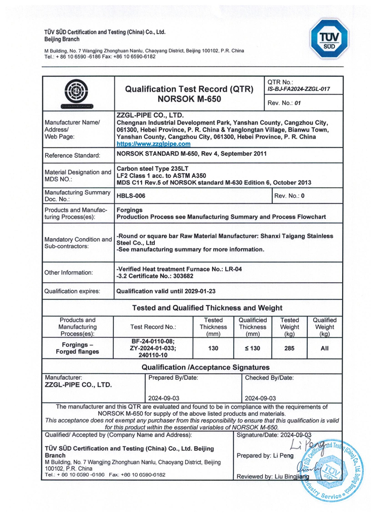 【概要描述】公司已取得:NORSOK M-650 ASTM A350 LF2材質鍛件的挪威國家石油標準認證。