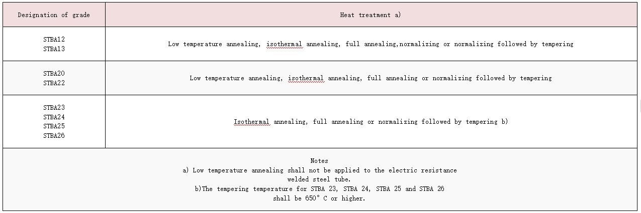 (c)Tubes shall be subjected to the Heat treatment specified in table 22.Other heat treatments not specified in table 2 shall be agreed between the purchaser and the manufacturer. - 管子應進行表22中規定的熱處理。表2中未規定的其他熱處理應由買方和製造商商定。
